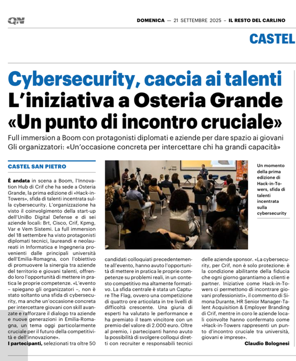 Hack-in-Towers, un hackathon sulla sicurezza informatica organizzato da BOOM, il Knowledge & Innovation Hub di CRIF. L'evento, dedicato a diplomati, laureandi e neolaureati in Informatica e Ingegneria, ha avuto come obiettivo quello di promuovere la sinergia tra le aziende del territorio e i giovani talenti.